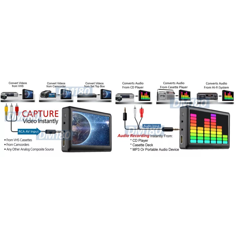 It can digitize analog video from VCR, DVD player and record videos from camera, TV box, game console into MP4 files and store the recorded files into a TF card or USB flash drive of user's choice..