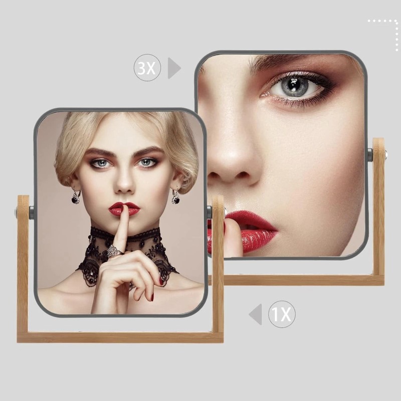 Unbranded Double Sided 3X Magnifying Makeup Mirror with Bamboo Stand, Grey