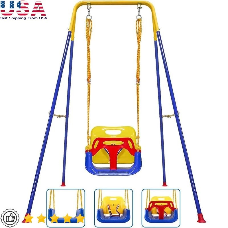 3-in-1 Toddler Swing Set: The swing seat features a removable 3-in-1 design that converts to different modes as your child grows, covering ages from 6 months to 10 years old. Easy to Assemble and Fold: The swing set can be easily assembled in about 10 minutes. You can assemble it together with your lovely kids, spend a happy parent-child time and exercise their hands-on ability at the same time. The metal stand can be folded to save space and easy to store. (40"D x 59"W x 61"H) Safe and Stable: Swing features a durable frame made of strong expandable steel for stability and durability. Triangular design for added stability. Comes with a sturdy rope and harness, perfect for toddlers and young children. Also features non-slip rubber feet that not only enhance stability but also protect the floor from scratches. High Quality Material: The baby swing is made of high quality plastic and powder coated metal, suitable for indoor and outdoor use, perfect gift for Children's Day and Christmas. Let your baby swing at birthday parties and spend more time playing outdoors and enjoying nature.
