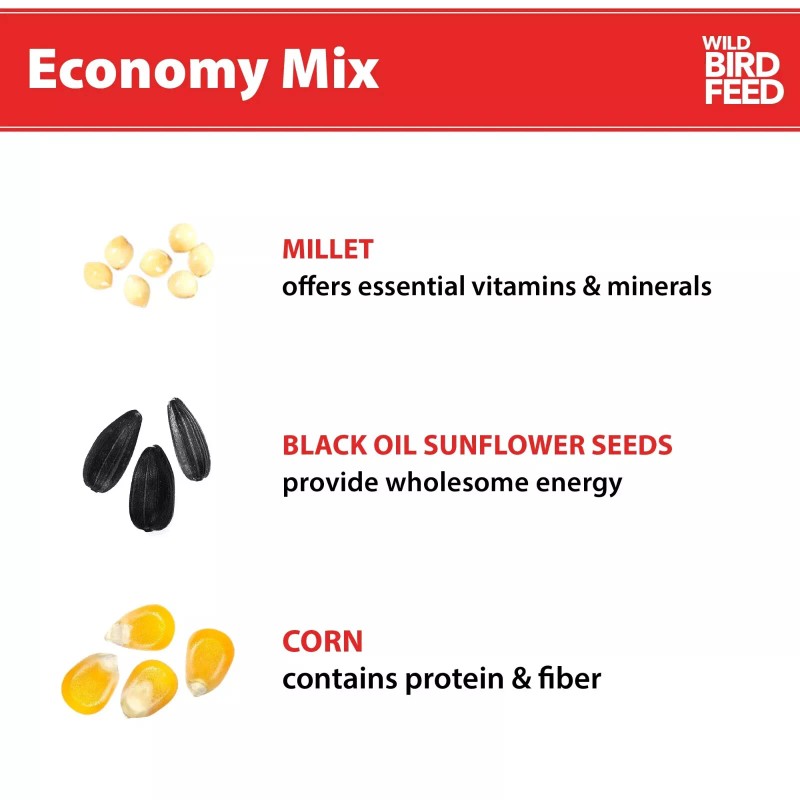 - Value blend of wild bird food, including black oil sunflower seeds, corn, and grain to attract a variety of wild birds to your feeders