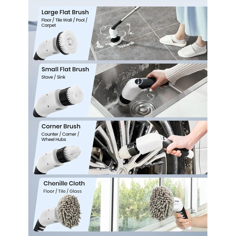 - 【Multi-functional Brush Heads】Our cordless cleaning brush offers versatile replaceable brush heads, suitable for different scenarios. For example, cleaning concave areas like bathtubs and sinks, cleaning narrow and hard-to-reach areas like corners and gaps as well as cleaning grounds, glass, tile wall, car surface, wheel hub, car seat, furniture and stove. As for how to use the corresponding brush heads, please refer to the instructions and images for details.