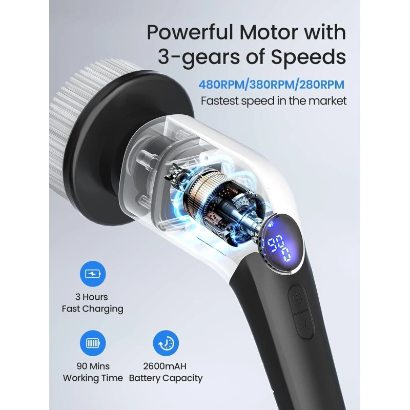 - 【Adjustable Speeds & 2500 mAh Battery Capacity】electric spin scrubber features advanced adjustable speeds up to 420RPM to handle various cleaning tasks. Powered by a high-capacity 2500 mAh lithium battery, it offers up to 90 minutes of continuous cleaning after a 2.5-hour charge, making it efficient and reliable for different needs.