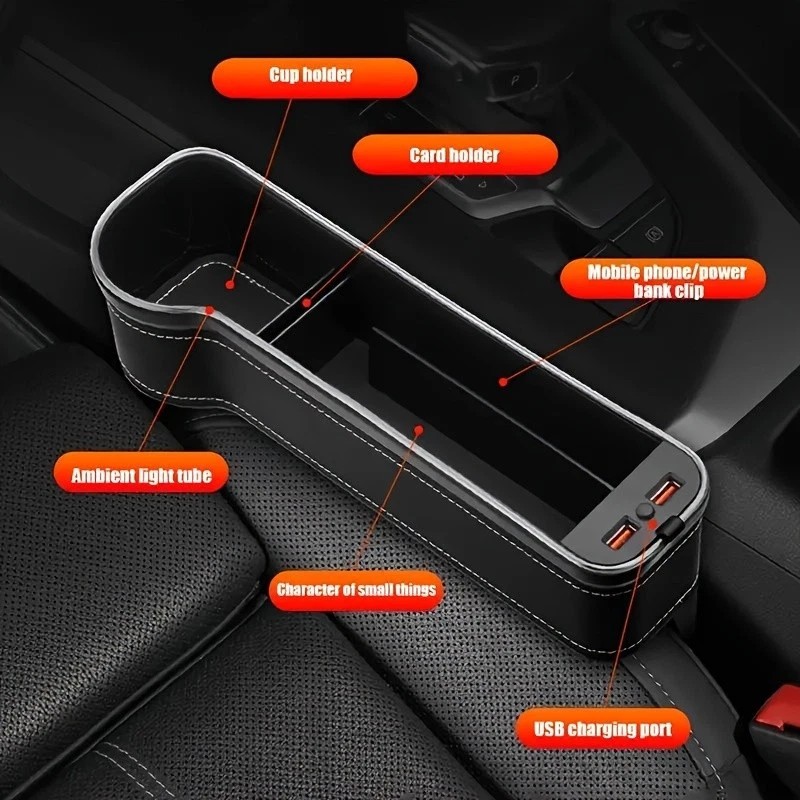 This car seat gap storage box solves cluttered vehicle interiors. Designed to fit snugly between your car seat and console, it keeps small items like phones, keys, and loose change organized and within reach. Equipped with dual USB charging ports, you can power up devices on the go, while the built-in phone holder keeps your screen visible for navigation. LED ambient lighting adds style and makes finding items easy in low light. The multi-function design combines storage, charging, and convenience, turning wasted space into a practical organizer—perfect for commutes or road trips to keep your car tidy.