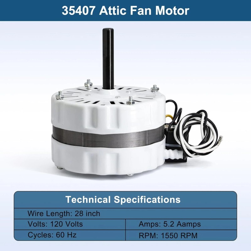- The 35407 AIR Vent Attic Fan Motor Technical Specifications -- ★Volts: 120 V, ★Amps: 5.2 A, ★Cycles: 60 Hz, ★RPM: 1550, ★Wire Length: 28 inch.