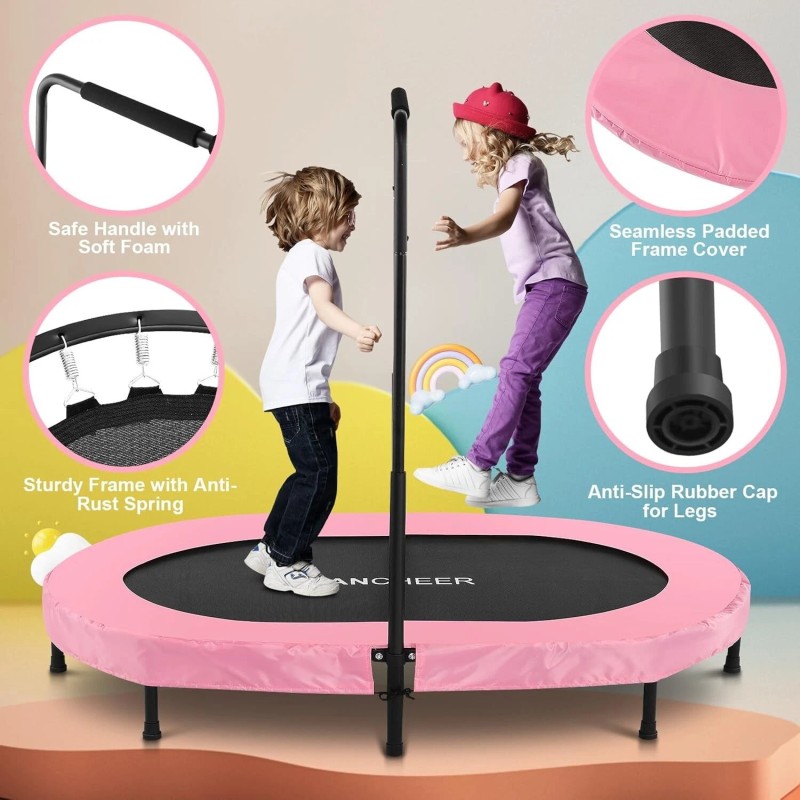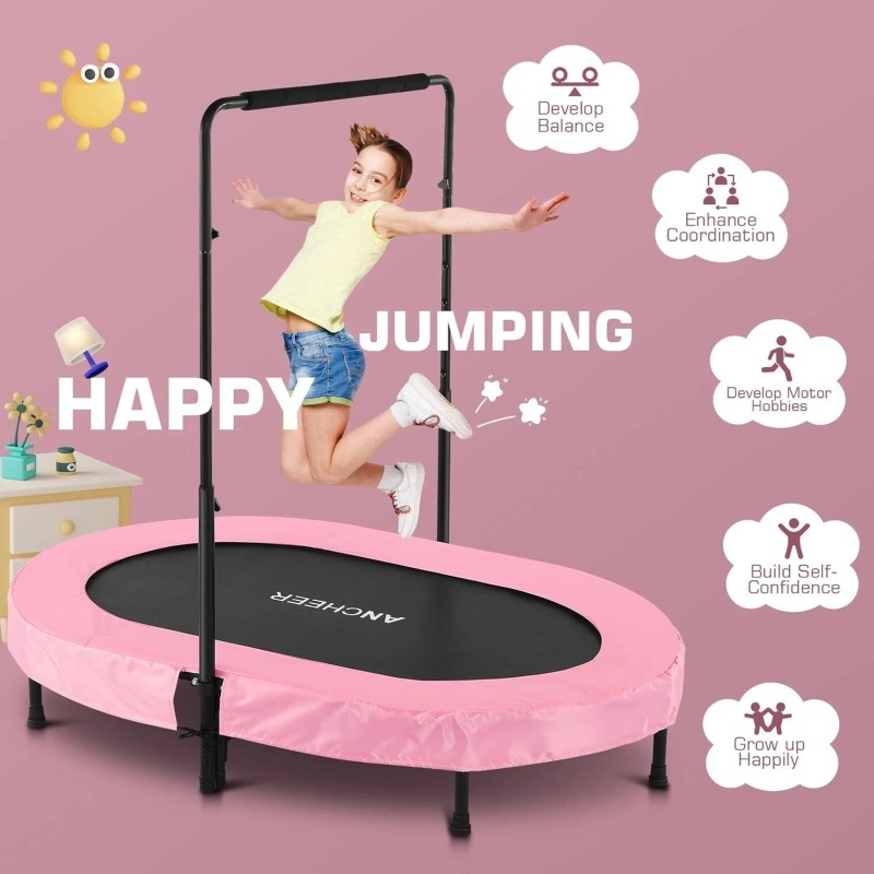 • 5-Adjustable Handle Design: This kids trampoline indoor comes with adjustable handle bars with 5 height levels to choose from and adjustments ranging from 38 to 45 inches for all ages.