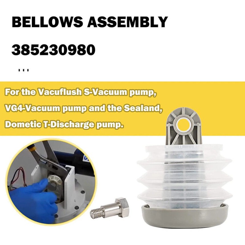 Pump bellow assembly is compatible with Dometic Sealand VG and VHT Series, Vacuflush S Series, J Series Vacuum Pump and T Series Discharge Pump, such as Model VG4, SW12, SW24, TW24, TW24. vacuflush toilet 12v #310245. Also suitable for 12v #310245, 24v #302400. Replace MPN: 385230980