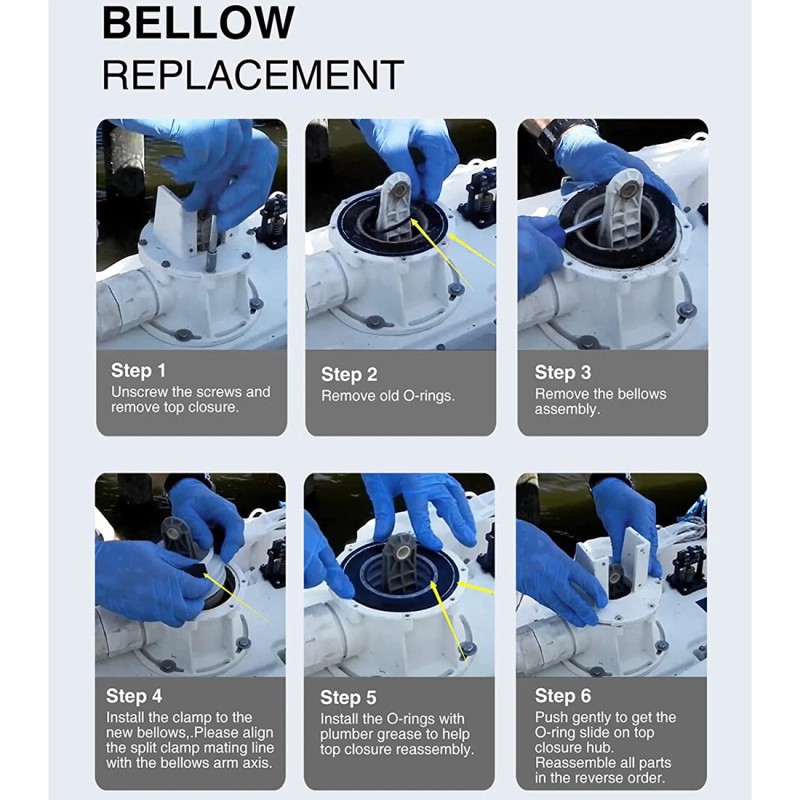 2) Remove the electrical motor, top closure, old O-rings and bellows assembly. Then, install the bellows clamp. Install O-rings with plumber grease to help top closure reassembly. Push gently to get the O-rings slide on top closure hub. Reassemble all parts following the reverse order. (Tips: Align the split clamp mating line with the bellows arm axis would help setting bellows arm alignment perpendicular to motor axis.)