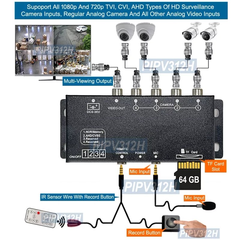 Each video input can accept 1080p/720p TVI, AHD, CVI type HD surveillance camera inputs and any analog BNC/RCA composite video from video camera or other analog video devices.