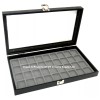 Lot of 2 glass top black leatherette finished display case with grey 36 space inserts.