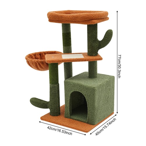 Specification Color: Green Style: Modern, Cactus-shape Material: Particle Board, Sisal Hemp, Flannelette, Paper Pillar Target Species: Cat Assembly Required: Yes Mounting Type: Floor Mount Load-bearing Capacity: About 7.5kg/16.53 lbs Product Size: 42*40*77cm/16.53*15.74*30.3in Package Size: 43*33*19cm/16.93*12.99*7.48in Gross Weight: 8.2kg/18.08 lbs Net Weight: 7.5kg/16.53 lbs