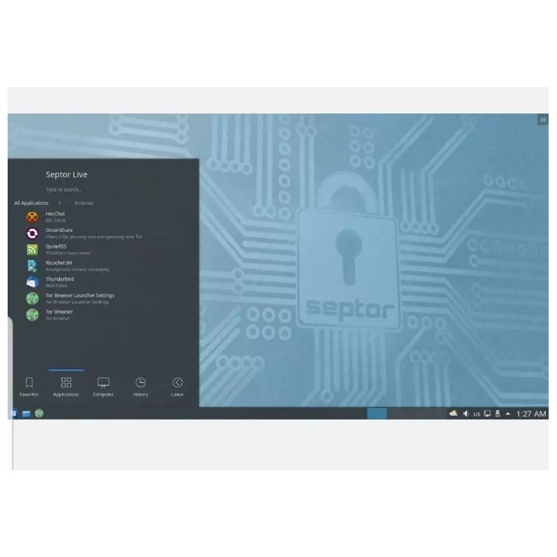 Septor is a Linux distribution which provides users with a pre-configured computing environment for surfing the Internet anonymously. It is based on Debian's "Testing" branch and it uses Privoxy, a privacy-enhancing proxy, together with the Tor anonymity network to modify web page data and HTTP headers before the page is rendered by the browser. The distribution uses KDE Plasma as the preferred desktop environment and it also includes a launcher for downloading the latest Tor Browser, OnionShare for anonymous file sharing, and Ricochet for anonymous instant messaging.