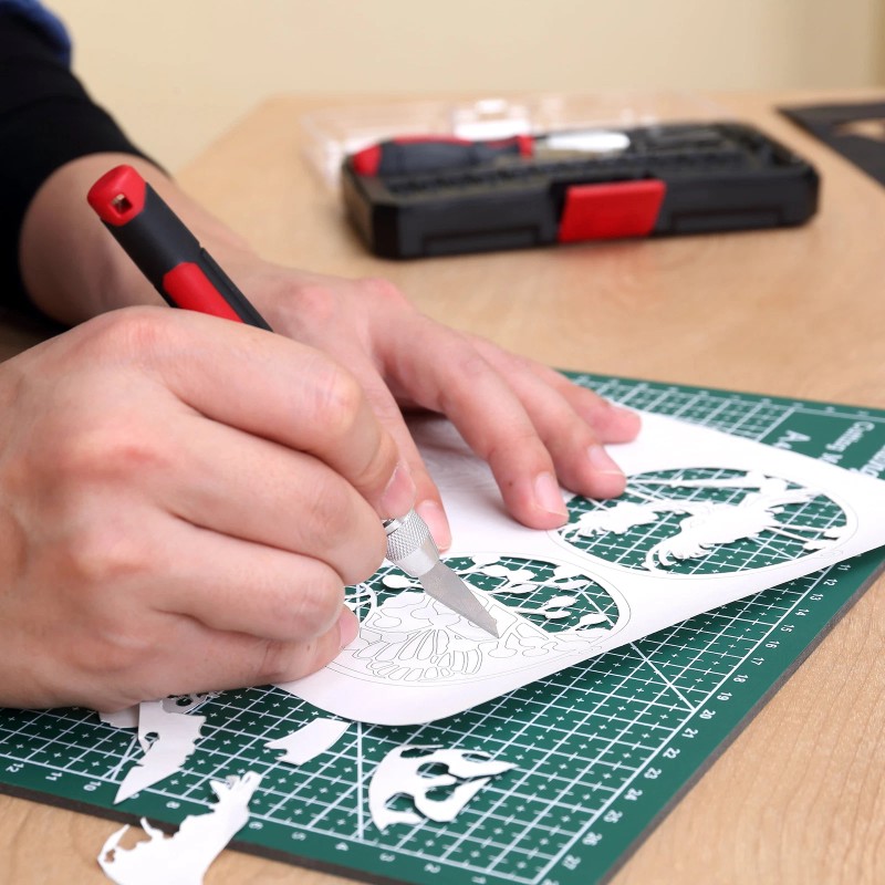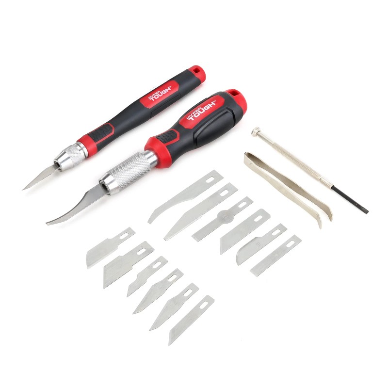 Set includes: 2-piece precision knife handles (with blades), 12-piece precision blades, 1-piece tweezers, 1-piece slotted precision screwdriver