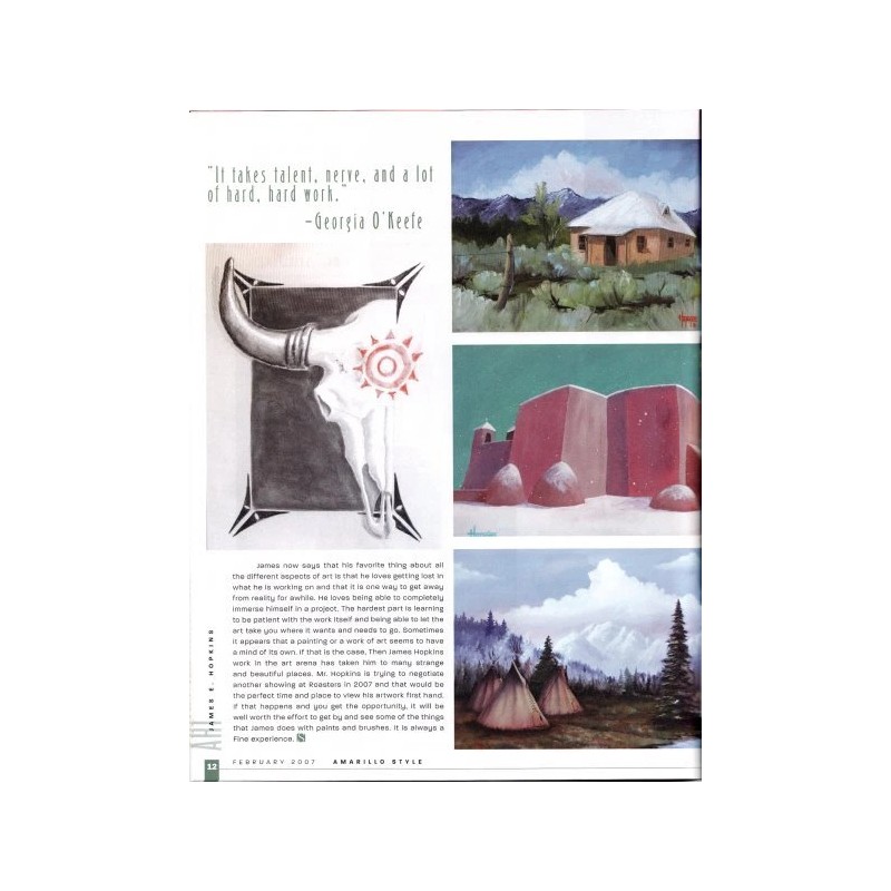 Left to his own devices Mr. Hopkins would prefer to paint with his favorite medium, watercolors. However, he also enjoys working with oils paints. James has also become a good layout and design artist. (Art Awards include "Best of Show" and "People's Choice". He also has works in the Navy Archives in Washington D.C.)
