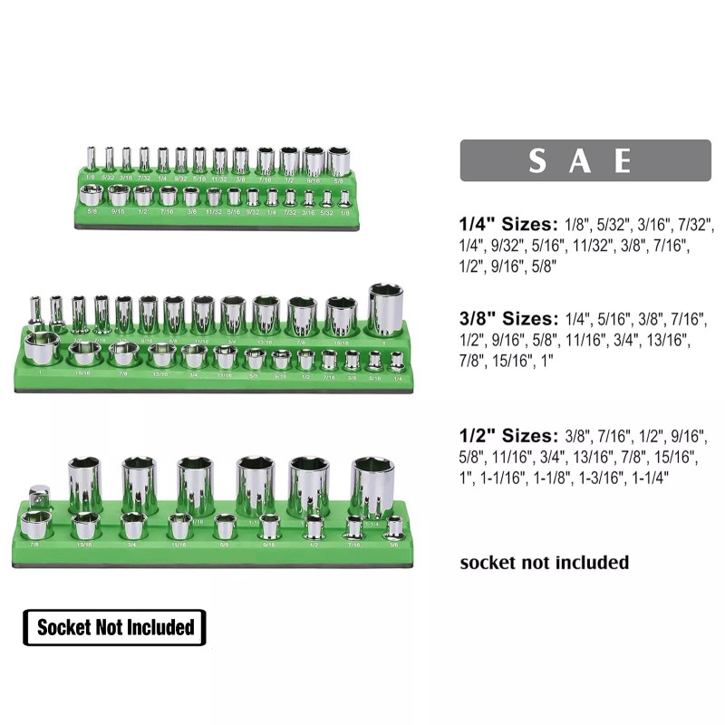 Large Capacity Magnetic Socket Organizer Set: These magnetic socket organizers can store up to 68 SAE sockets. The kit includes three Green SAE magnetic socket organizers for 1/4", 3/8" and 1/2" drives. They collect SAE receptacles but not for impact sockets. Tip: sockets are not included with the holders.
