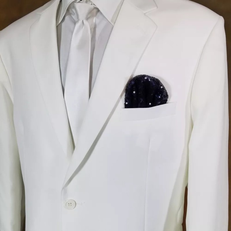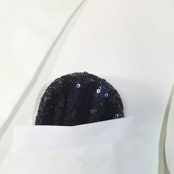 Dress up your tux, suit or sport coat with this sequin pre-folded pocket square. It's easy to use and looks like a well place pocket square. Just slip the insert into your breast pocket.