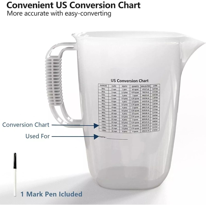- 【Food Grade Material】Large 1 Gallon measuring cup manufactured from food-grade polypropylene with wide chemical resistance. This measuring pitcher won’t break down, chip, cloud, or discolor
