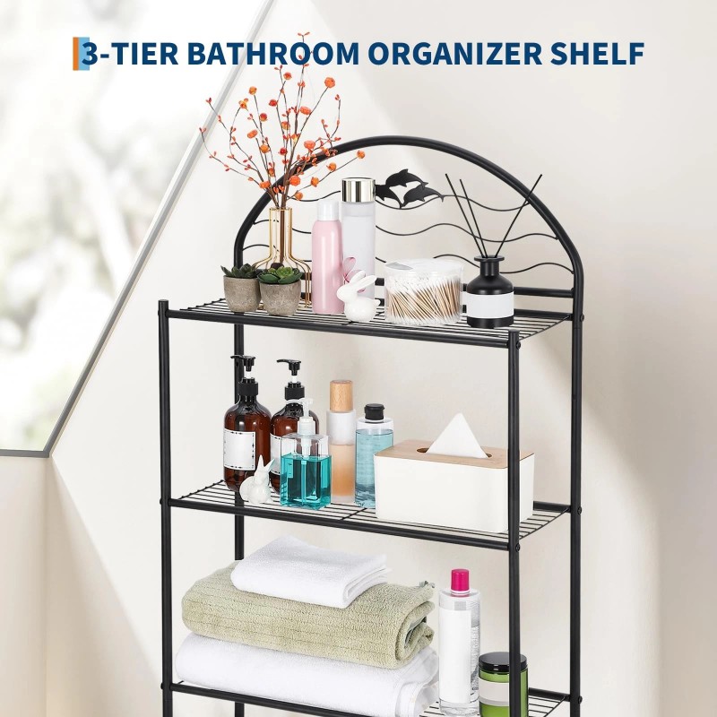 --Playful Design: This above toilet storage has a modern black finish, semi-circular top, and wave-inspired wire design with dolphin accents, adding elegance to your bathroom. Its stylish appearance complements any decor while providing practical storage