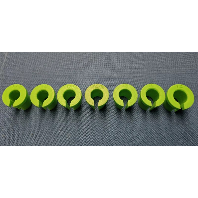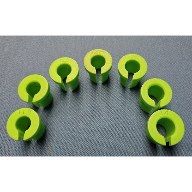 This is a set of 3d printed collets for pool cue tip changes and shaft maintenance. All edges are chamfered, and each bore is designed with a slight taper to help conform to the taper of the cue shaft. Each collet is made oversized to work with a range of shaft sizes in order to account for the slight variations from different manufacturers. Each set is made to order. The sizes are as follows : 11.8mm, 12mm, 12.25mm, 12.5mm, 12.75mm, 13mm, and 14mm. Custom sizes are available at an additional charge. Feel free to message me.