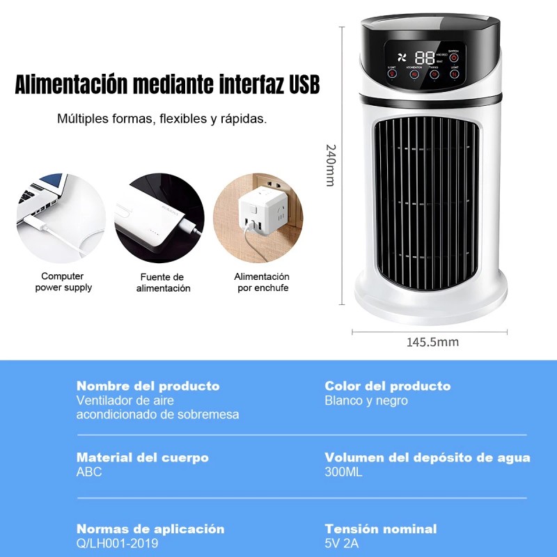 Powerful Cooling Performance: This 9.8'' tall small tower fan is equipped with a 300ML water tank and evaporative air cooling technology, providing efficient and quick cooling to help you beat the heat on hot summer days. It can also be conveniently powered through a USB port, making it easy to use and reducing electricity costs.
