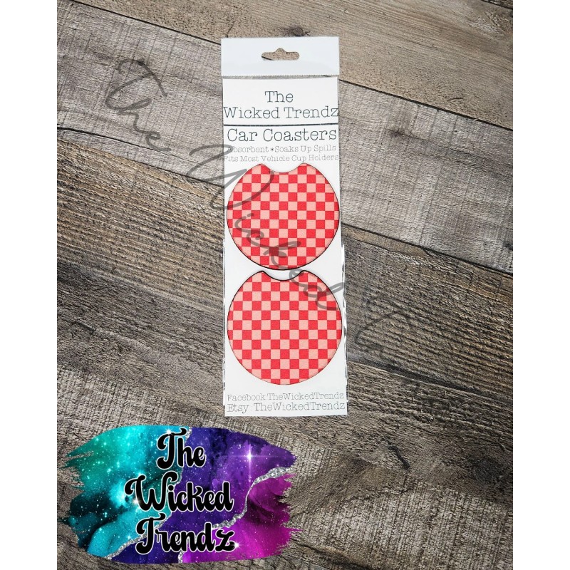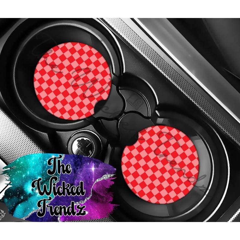 Unbranded Red Retro Checkered Patterned Print Car Coasters Set Of 2 Cup Holder Car Gift