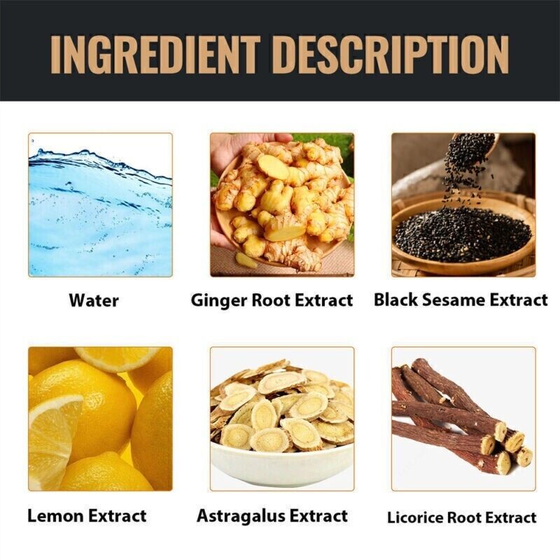 Ingredients: Water, Licorice Root Extract, Ginger Root Extract, Black Sesame Extract, Lemon Extract, Astragalus Extract