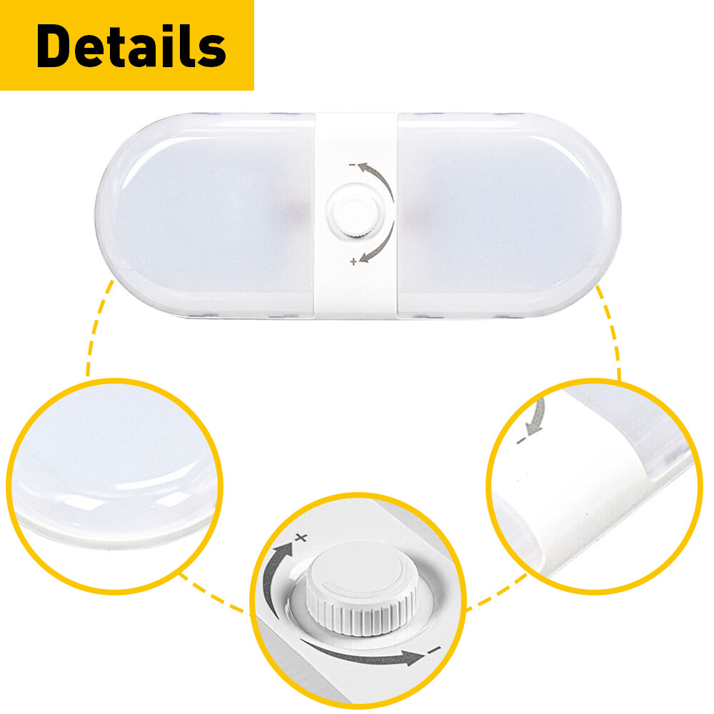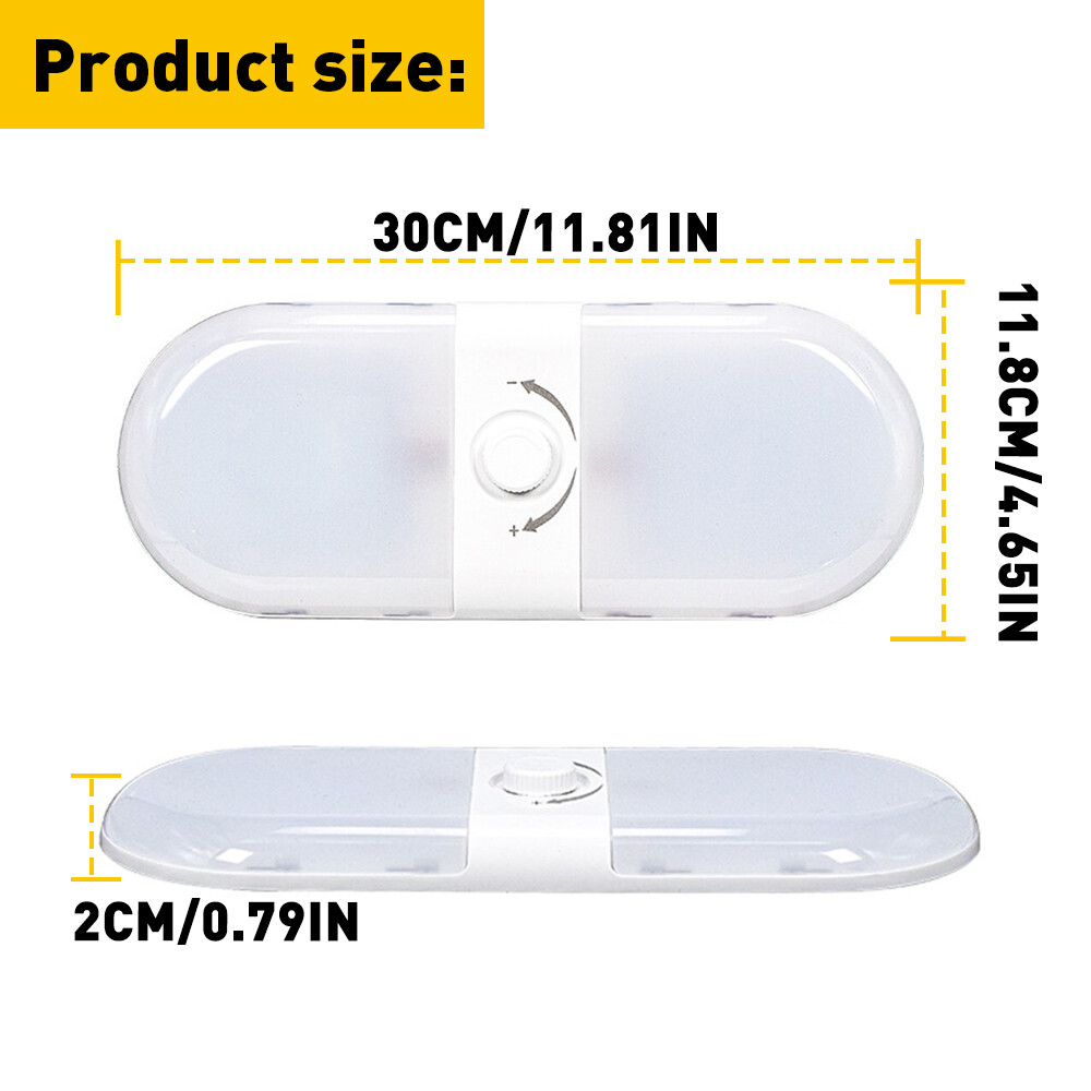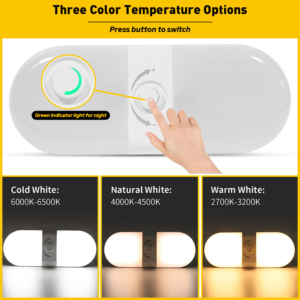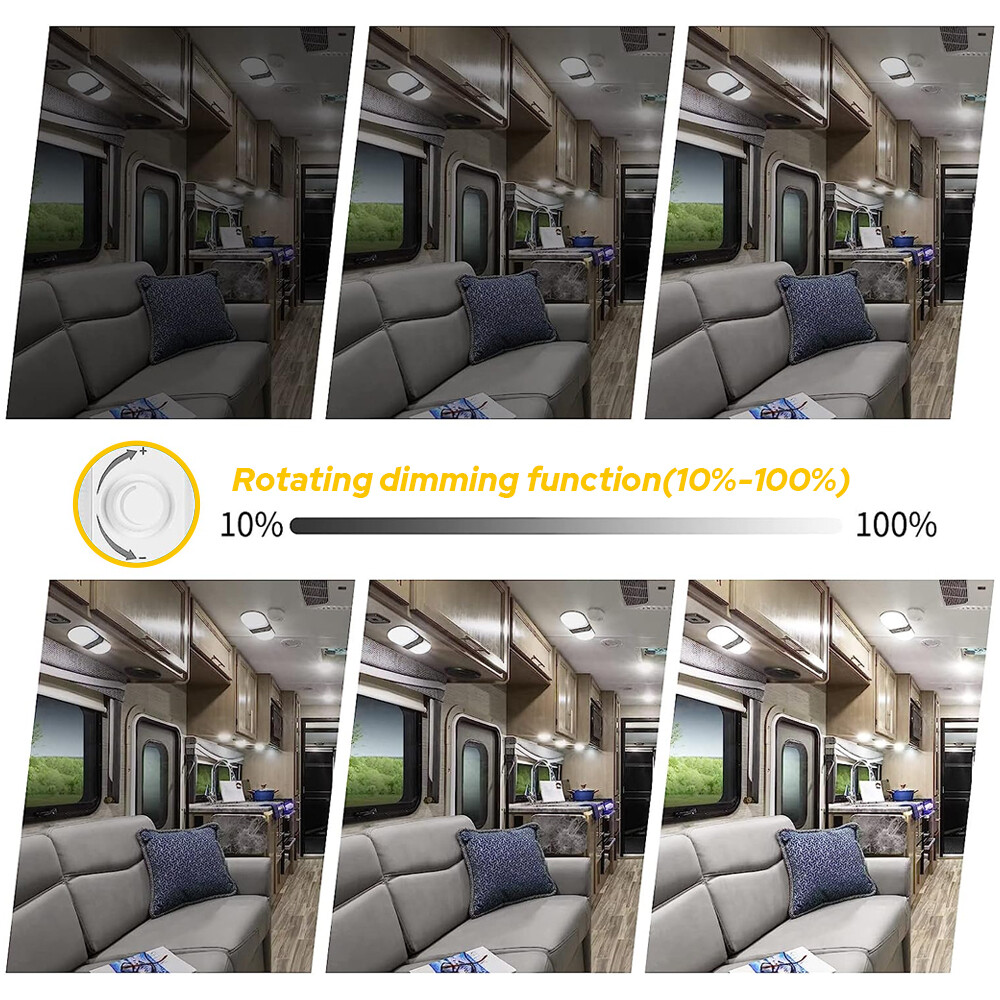 Features: *3 Color RV Interior Light RV interior lights have 180 light beads evenly distributed (90 cool white and 90 warm white), which can achieve 3 color modes (warm white/natural white/cool white). 1.Warm white is suitable for lighting at night before sleep. 2.Natural white is suitable for reading and writing. 3.Cool white is suitable for lighting activities at night. * 3 Color Temperature Switching 1. Short press the switch to change the colors between white(6500K)/warm white(4200K)/warm(2700K); 2. Long press the switch to turn OFF the light; 3. Rotate the switch to adjust the brightness from 10%-100%.(Flexible to compatible with your daily habit and easy to control.) *Memory Function & Night Light Indicator The 12-volt LED lights with a night light indicator(soft green glow) on the switch help you find the light button without opening another night light at midnight. *Easy to Install 1.Open the light cover(press and hold the light cover to remove it to both sides) 2.Fix the screws through the holes on the light board to the place you want to install. 3.Connect the wire and cover the wire crimping cap. *Eye Protection Design Adopts uniform distribution of light beads and thickened PVC lampshade design to make the light scatter evenly without dazzling and spots, which is suitable for small space lighting.