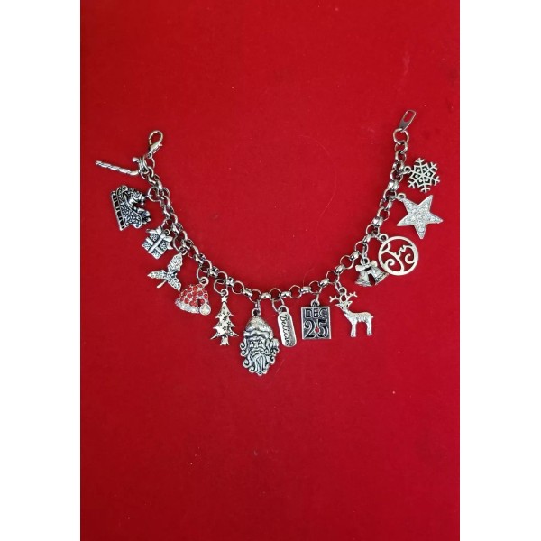 Charms consist of a candy cane, santa's sleigh, a gift, holly, rhinestone Santa's hat, Christmas tree, Santa Clause, believe, December 25th with rhinestone, reindeer, Bells, joy, rhinestone star and snowflake
