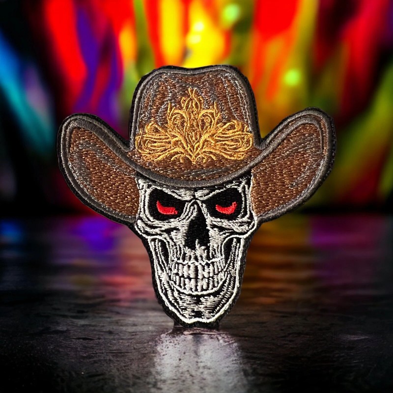 Crafted with meticulous attention to detail, this Skeleton wearing a cowboy hat patch showcases a grinning skeleton donning a classic cowboy hat, adding a touch of humor and personality to your accessories. The vibrant colors and intricate embroidery make this patch a standout addition to your collection.