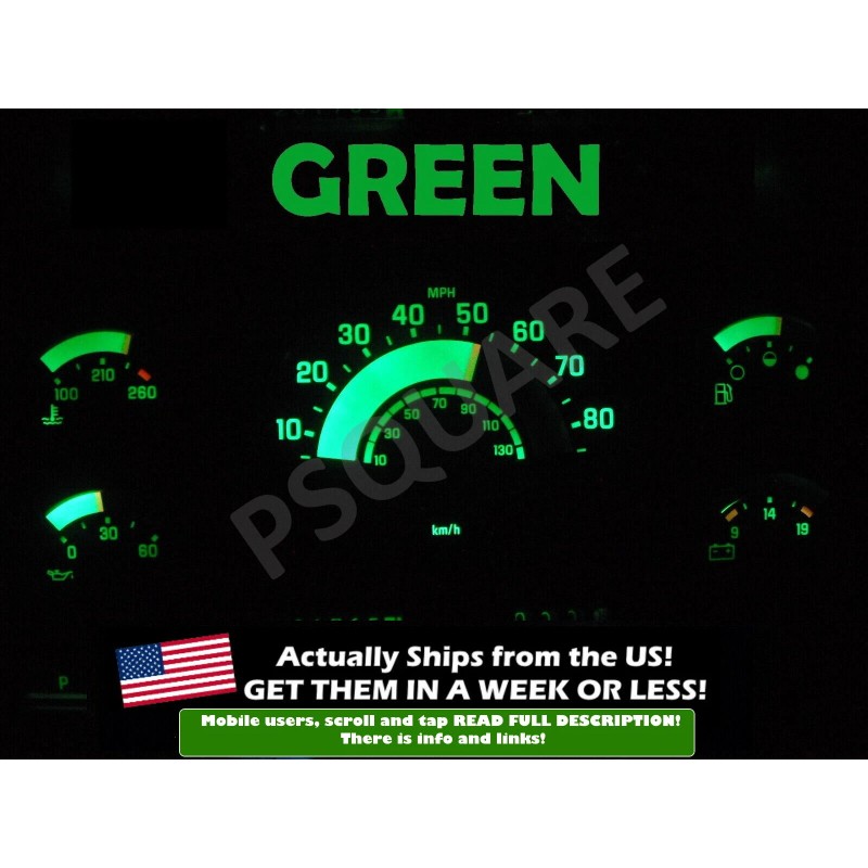 MOBILE USERS PLEASE CLICK READ FULL DESCRIPTION!This is for a set of 5 LEDs that will greatly increase the visibility of your trucks gauge cluster at night.These LEDs are 'green' in color. Same color as a turn signal indicator.When installed in a cluster, they will provide a bright, rich vibrant color.Please note, you must disassemble your cluster and install these on the inside.These will fit all the 88-91 C/K Clusters, both idiot light and four gauge clusters.