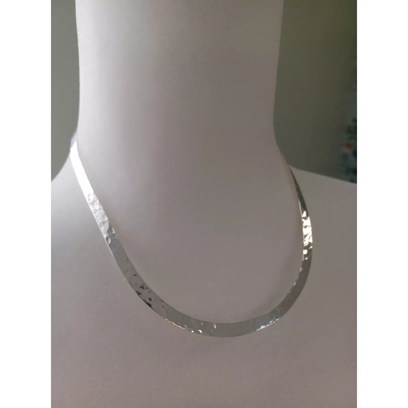 It has a U/open back design and silver plated, 5mm hammered finish make it a stylish statement piece that is sure to turn heads. Lays on neck very nicely.