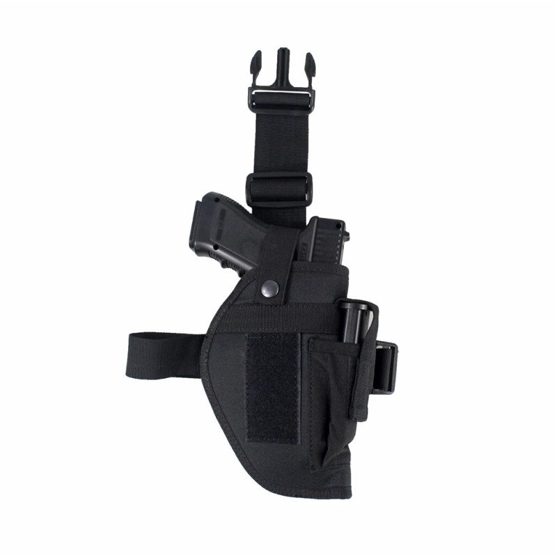 Holster includes Thumb Snap, a single Magazine Pouch on the front of Holster, adjustable for Drop Leg Height with Quick Release Buckle, a nd adjustable Thigh Strap with Quick Release Buckle.