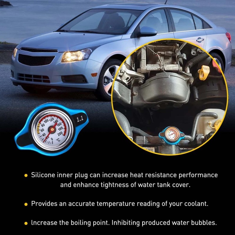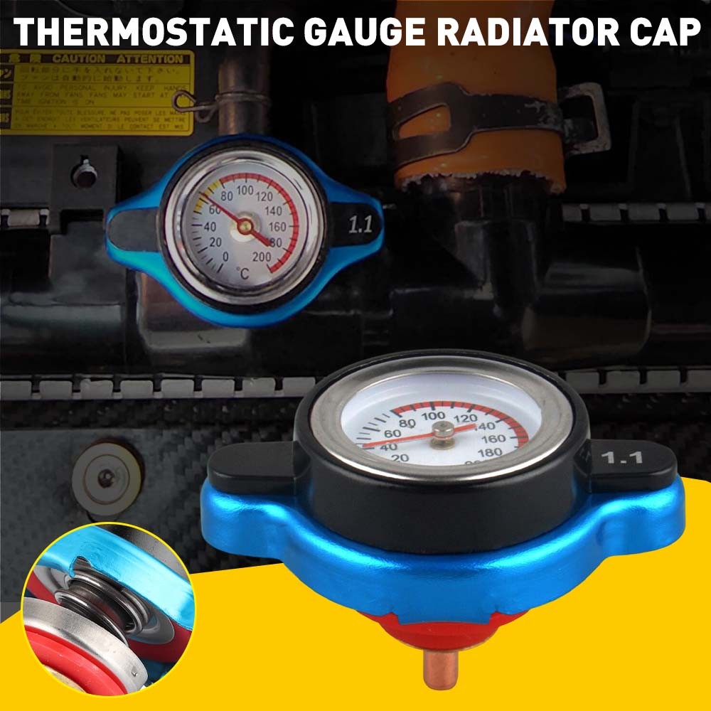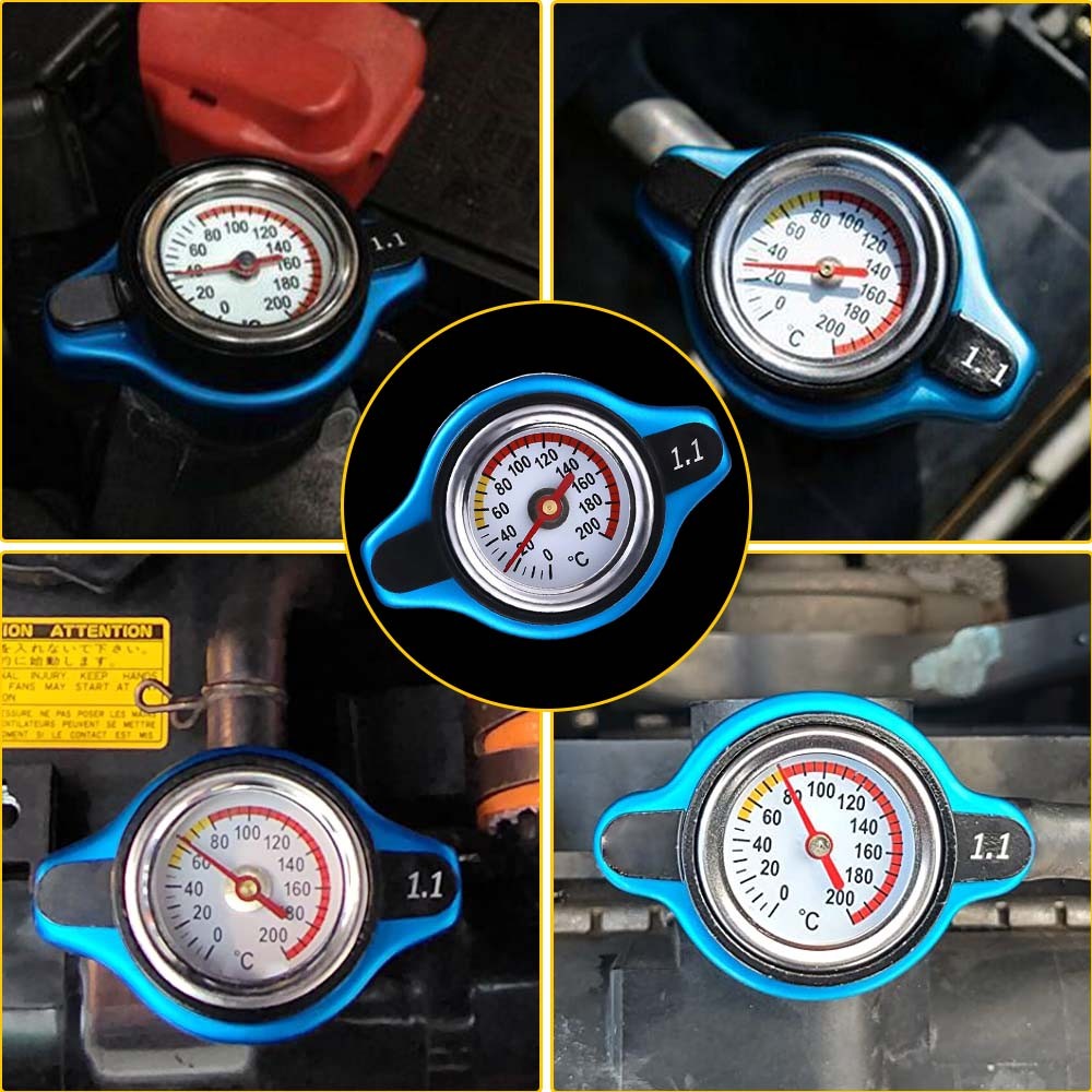 *The radiator cap with temperature gauge The radiator cap with temperature gauge not only prevents the water tank from leaking, increasing the tightness of the water tank cover, but also adjusting the pressure balance for the water tank to keep the water level balance. A safety water tank cap with a temperature gauge can show you the accurate water tank temperature without launching the engine. And the silicone inner stopper helps enhance the heatproof function and the compactness of the tank cap.