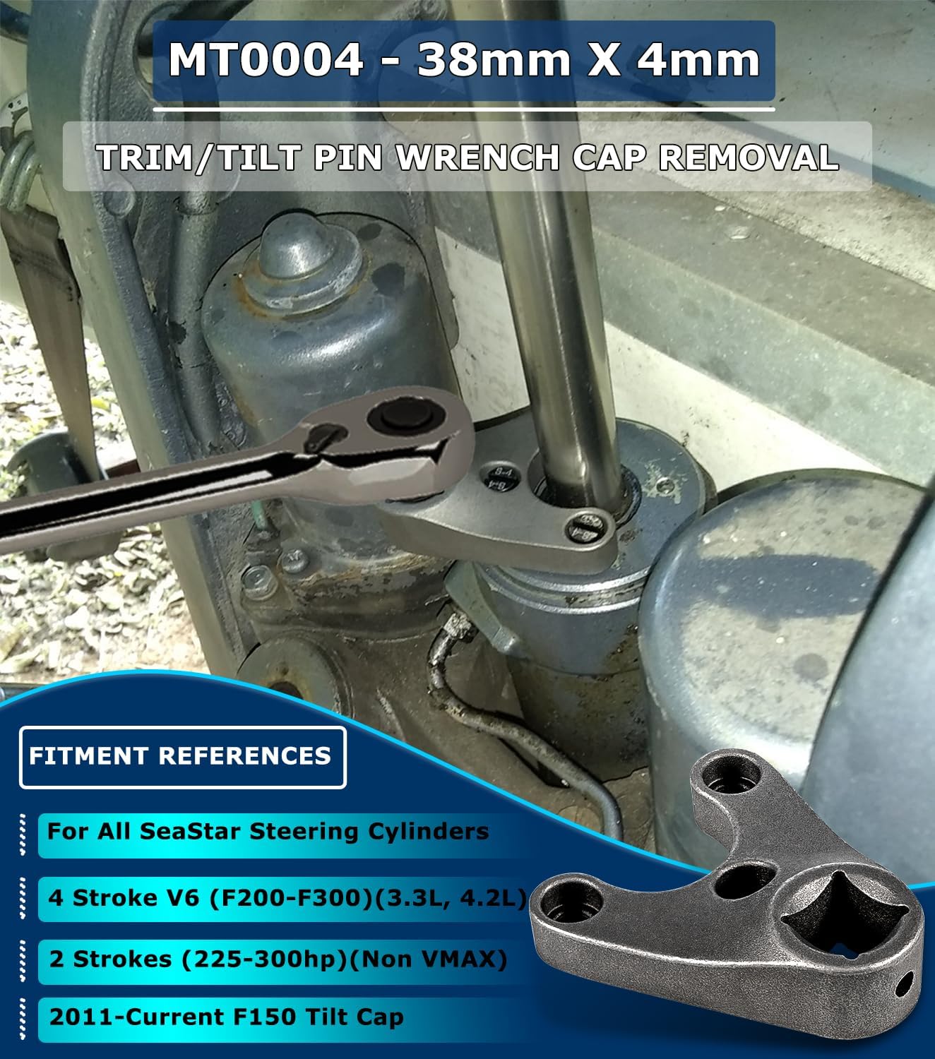 - APPLICATION -- Fits for all Seastar Steering Cylinders, Trim and Tilt Caps on all Four Stroke Yamaha V6 (F200-F300)(3.3L, 4.2L), Trim and Tilt Caps on Non-VMAX 2 Strokes (225-300hp), and Tilt Caps on the 2011-Current F150. (This wrench is not compatible with VMAX.)