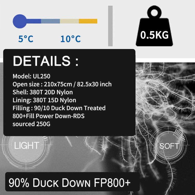 Weight : The sleeping bag weighs 250 grams (approximately 8.8 ounces), making it incredibly light and easy to carry on hikes or backpacking trips.