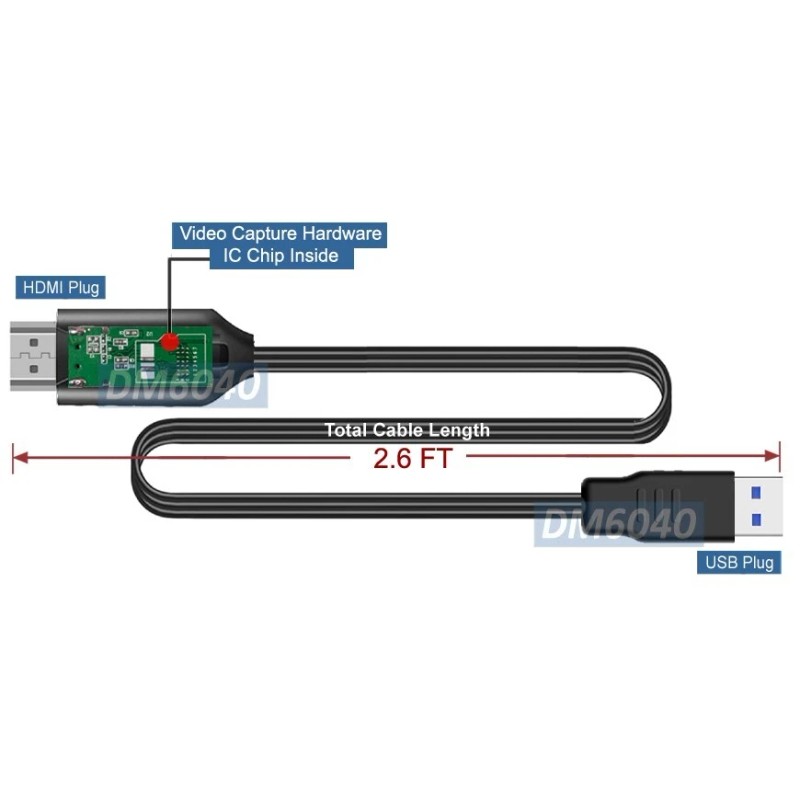 This USB HD video capture dongle has a 2.6 feet long USB cord for hookup.
