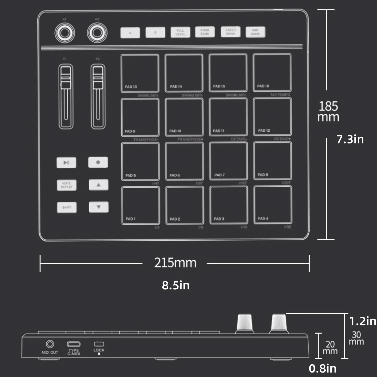 USB MIDI Controller Beat Maker 16 Beat Pads 2 Fader Knobs Drum Machine