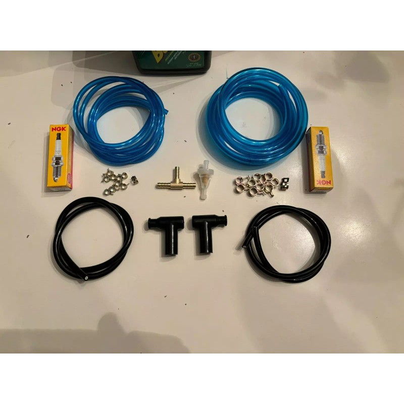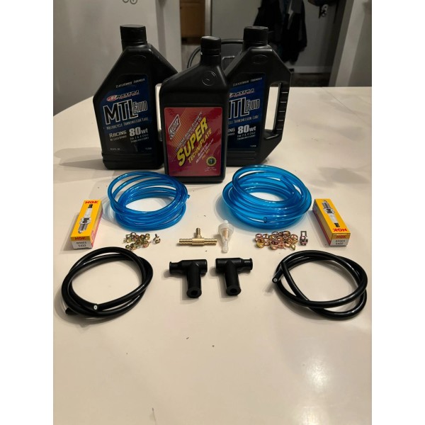 ITEMS UP FOR SALE FOR STOCK YAMAHA BANSHEE CARBURETOR YOU GET 10 CLAMPS AND 6FT OF BLUE VINYL FUEL LINE 1/4 HOLE AND WITH 3/8 OUTSIDE MEASUREMENT,6 FT OF 1/8 VENT HOSE+10 CLAMPS,1 FUEL FILTER AND 1 BRASS FUEL LINE T. THE FUEL LINE IS SPECIALLY FORMULATED TO RESIST FUEL AND OIL,WAS TESTED WITH 15% METHANOL WHICH IS GREATER THAN ETHANOL,SOFT AND FLEXIBLE,TEMP RANGE -22 TO 195 F .REPLACE THAT WORN OUT FUEL LINE AT A GREAT PRICE.Vinyl Fuel & Lubricant Tubing.YOU ALSO GET 2 BOTTLES OF 80W MAXIMA TRANS OIL AND ONE 32OZ BOTTLE OF KLOTZ SUPER TECNIPLATE OIL, 2 NGK BR8ES SPARK PLUGS AND 2 SPARK PLUG CAPS THAT WORK WITH THE NUT OF THE TOP OF THE SPARK PLUG WITH THREADS SHOWING AND 2 SPARK PLUG WIRES 18 INCHES LONG.KLOTZ OIL IS FOR PRE-MIX ONLY NOT FOR OIL INJECTION.