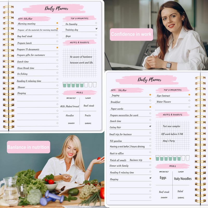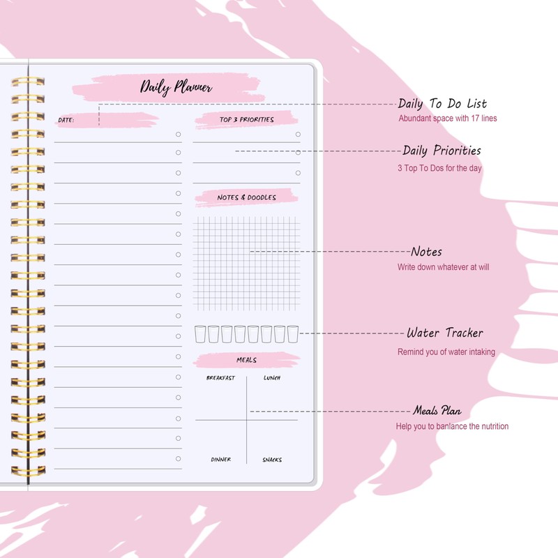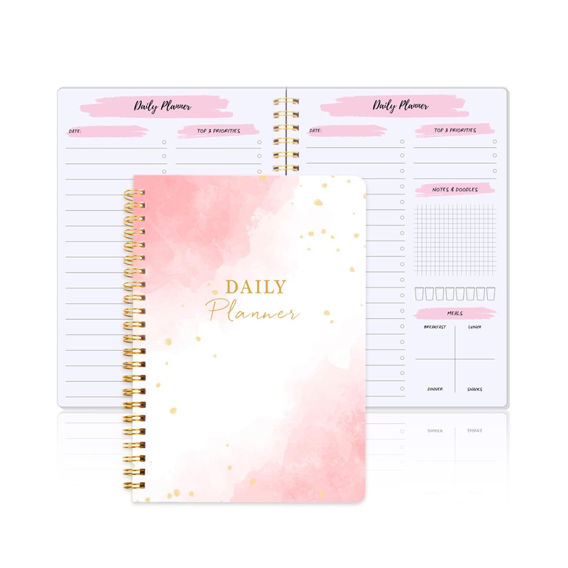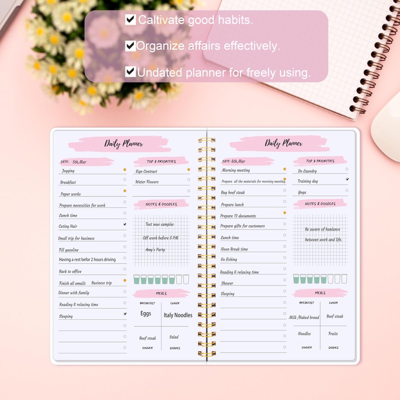 Undated Daily Planner To Do List Notebook,Meals Plan, Water Tracker with Flexible PVC Cover, A5 size,Pink