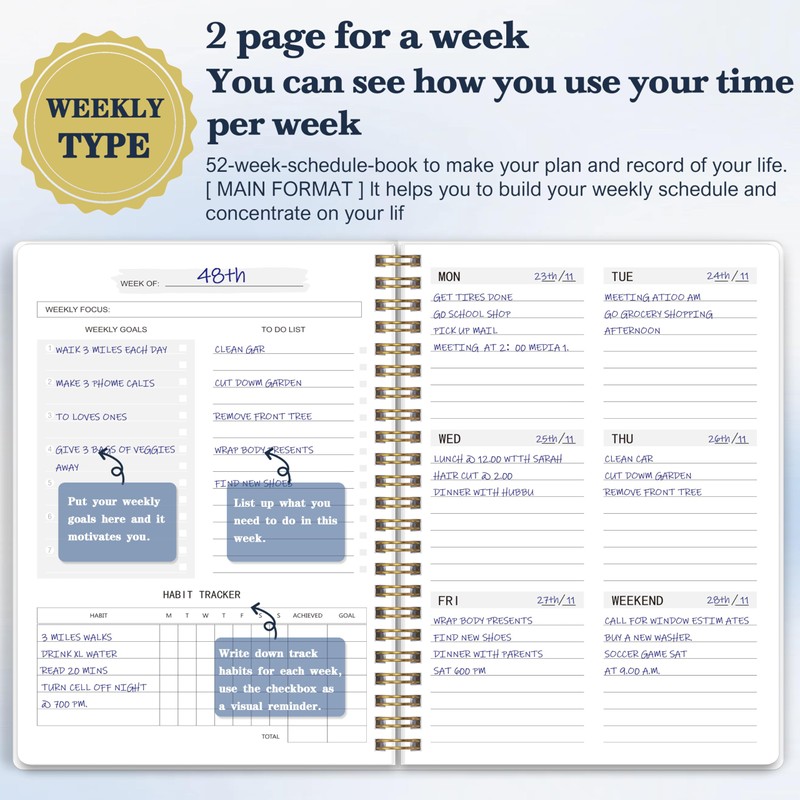• 52 Weeks Undated Planner:Write down and prioritize your Weekly goals & to do list and then assign tasks to each day for maximum efficiency. No guilt if you miss a week.