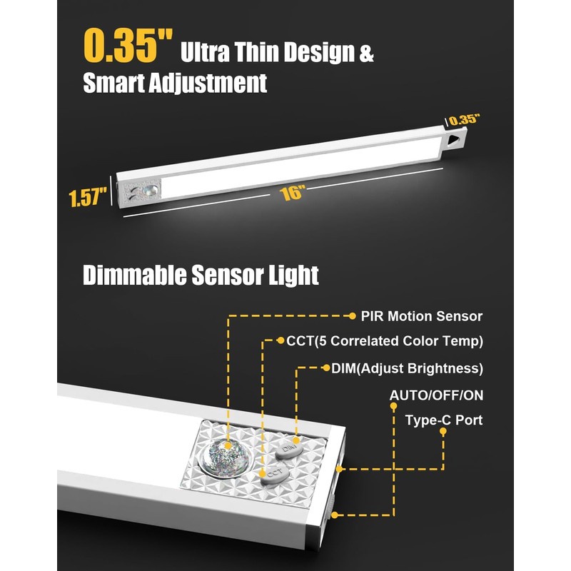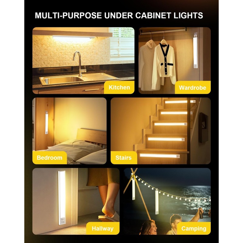 - PIR Motion: TheDeco cabinet lights have the ability to detect human motion within a 10 ft/120° range, automatically switching off after 25 seconds of inactivity. Take advantage of the convenience provided by 3 different operating modes: Always-ON, Auto Mode, or OFF—these can be easily accessed with a switch. After activating the motion sensor mode, it will bring great convenience to your life, and you no longer have to worry about waking up at night without finding light