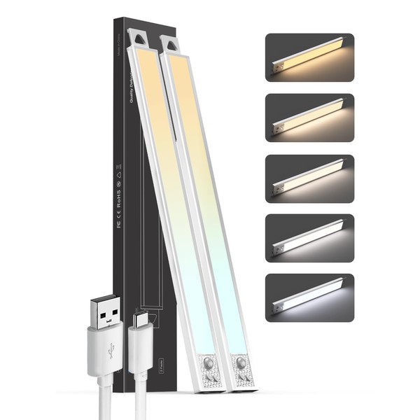 Under Cabinet Lighting 16'' Motion Sensor 5CCT Dimmable 78-LED Light, 2000mAh Rechargeable Closet Lights Wireless Battery Operated Under Counter Light for Kitchen Bedroom, White, 2Pack