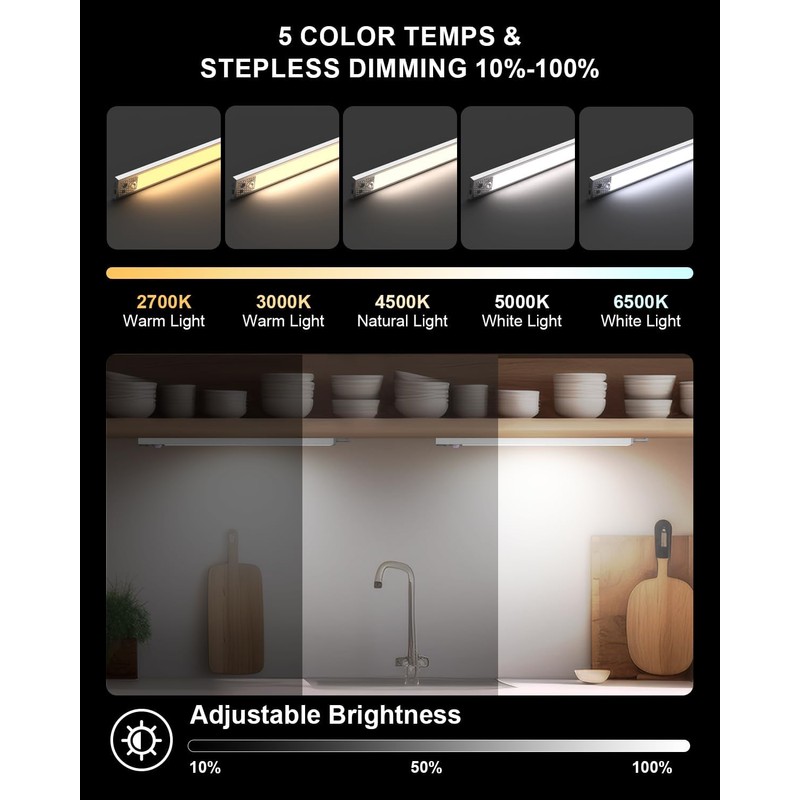 - Light Corol: Under the control of CCT, you have 5 color options (2700K/3000K/4000K/5000K/6500K). Our lamps have a color rendering index (CRI) of 80+ that adapts to the environment, ensuring the perfect illumination of American eyes. With the stepless dimming feature, Deco cabinet lights can meet the lighting needed whether you are elderly, children, or young people