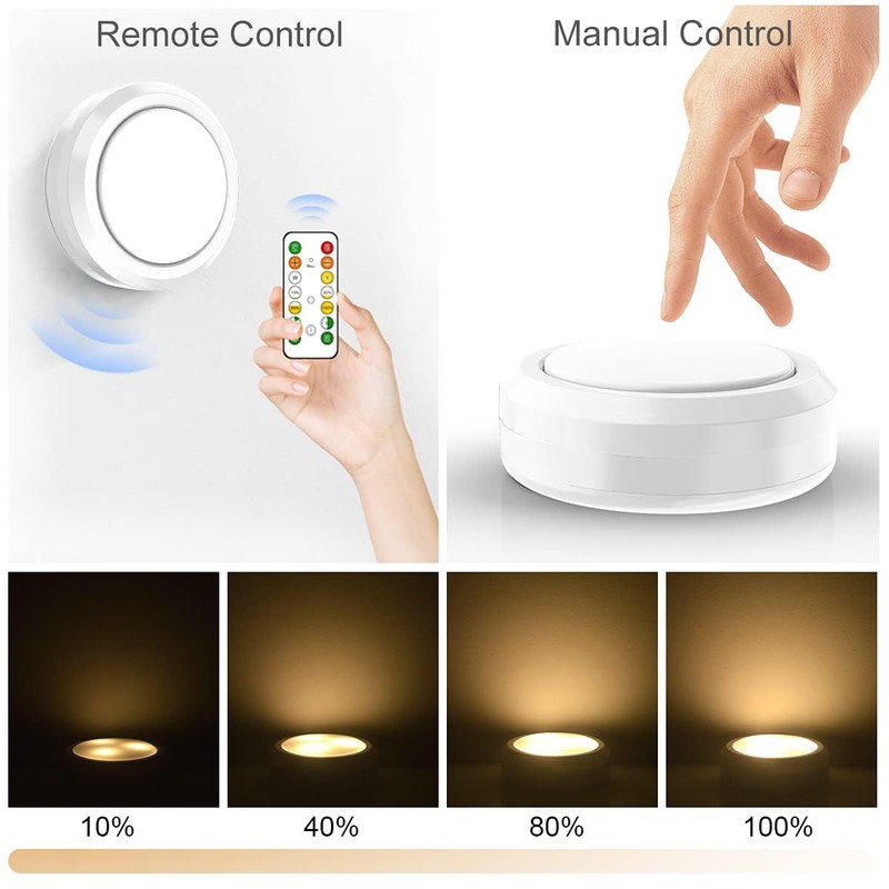 - Two control modes and adjustable brightness time setting: Puck lights are equipped with a remote control that allows you to control the lights remotely and adjust colour/brightness/time setting. You can also press the lampshade to turn on the light/adjust the light colour. Longer pressing can help you find the most suitable brightness. There are 4 brightness modes: 10%, 40%, 80%, 100% and the time function of 10 min, 30 min, 60 min, 120 min, which allows you to adjust the lighting individually.