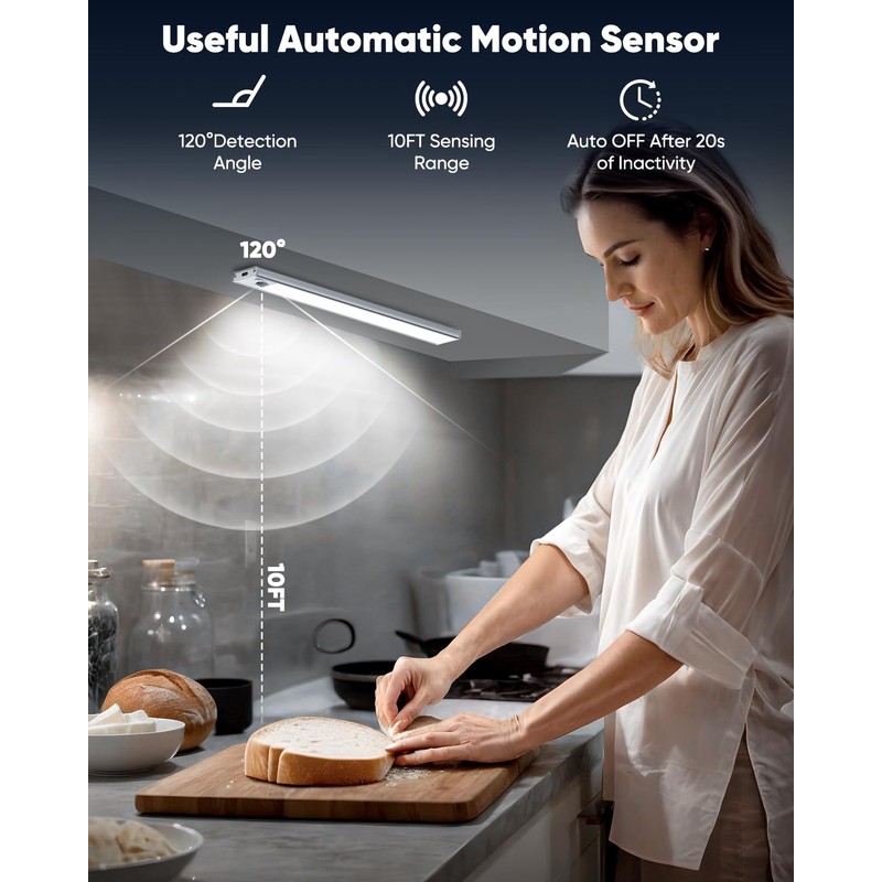 - Convenient Under Cabinet Motion Sensor Lighting: The Motion Sensor boasts detection angle of 120° and a sensing range of 10FT, ensuring comprehensive coverage of large areas and enhancing both ease of use and comfort. Additionally, the rechargeable under cabinet lights automatically switch off after 20 seconds of inactivity, promoting energy efficiency. By eliminating the need to search for switches in the dark, they offer significant convenience to you and your family