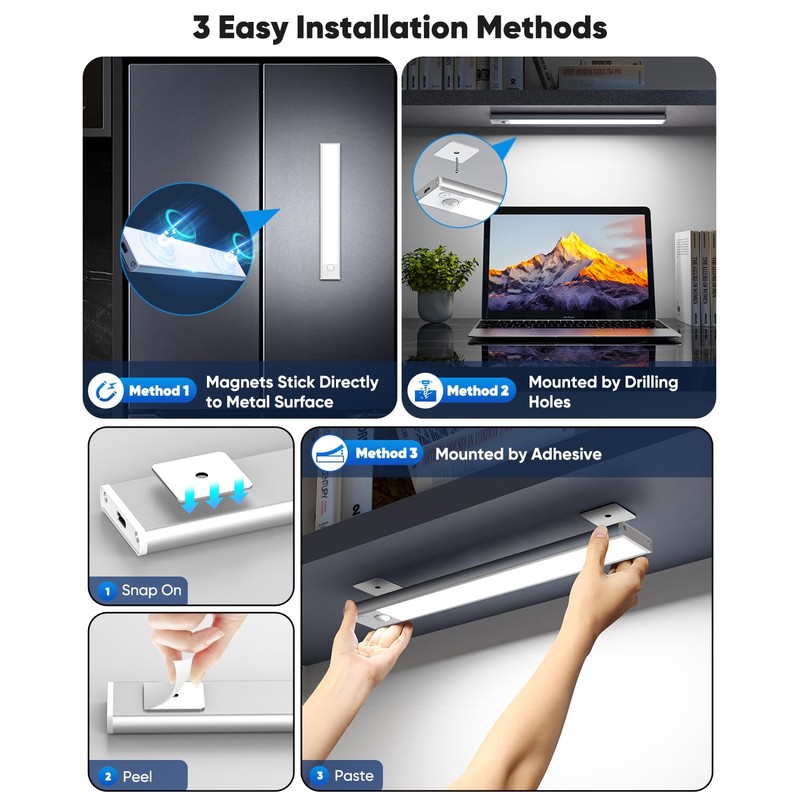 - 3 Easy Installation Methods: Our magnetic under cabinet lighting boasts a straightforward installation process, minimizing the time commitment required:①Magnetic Attachment: The built-in powerful magnets can adhere to ferromagnetic surfaces.②Adhesive Metal Plate: Use the accompanying metal adhesive plate to directly stick the light to the desired location.③Screw mounting: If you want to mount the cordless under cabinet light on the wall, you can securely install it using the provided screws and by drilling holes