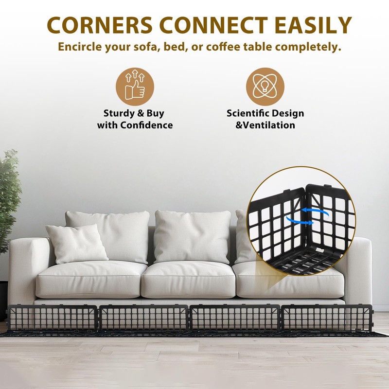 - 【Durable Construction】Each panel is molded from high-quality, heavy-duty plastic that is both impact-resistant and flexible. The dimensions of one panel are 14.58 inches in length, 4.73 inches in width, and 6.7 inches in height. The L-shaped design is intended for sofas or any other furniture pieces that have a bottom clearance greater than 6.7 inches.