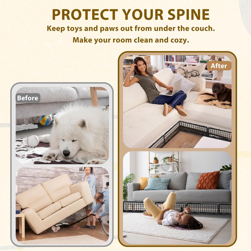 - 【Assembling Under Couch Blocker】This package contains 12 individual plastic panels that can be connected together and taken apart again whenever you wish. Once assembled, the barrier slides neatly beneath your sofa and prevents household pets from crawling underneath. At the same time, it stops small toys and other loose items from rolling under the furniture.