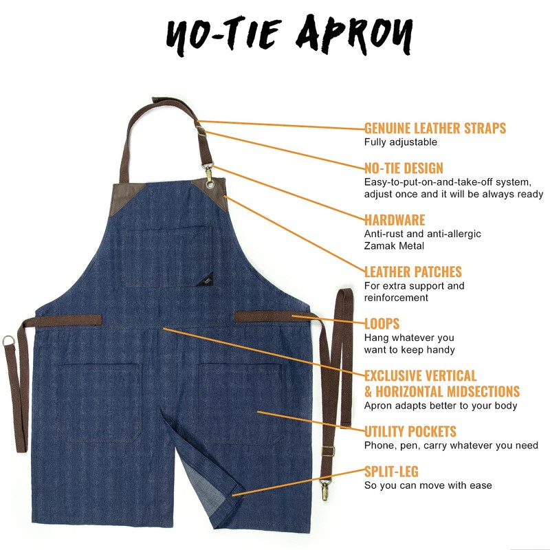 The No-Tie Collection is built with vertical and horizontal midsections allowing the apron to adapt better to your body, while the split-leg lets you move with ease. Still, they come with 2 loops, plus phone, pen, and lots of utility pockets.