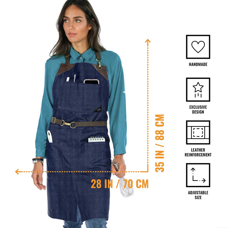 - HANDCRAFTED, DURABLE QUALITY – This apron is handmade with durable mid-weight 10 oz Denim, reinforced with genuine leather patches, 100% cotton straps to avoid allergies and guarantee your comfort, and durable anti-rust vintage brass metal hardware, grommets and clasps, with anti-allergic Zamak coating for extra support. Double stitched utility pockets and thick top and bottom hems for strength and structure.