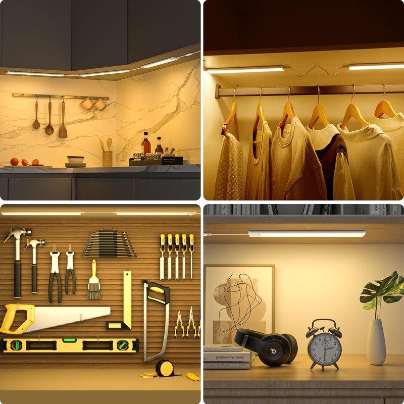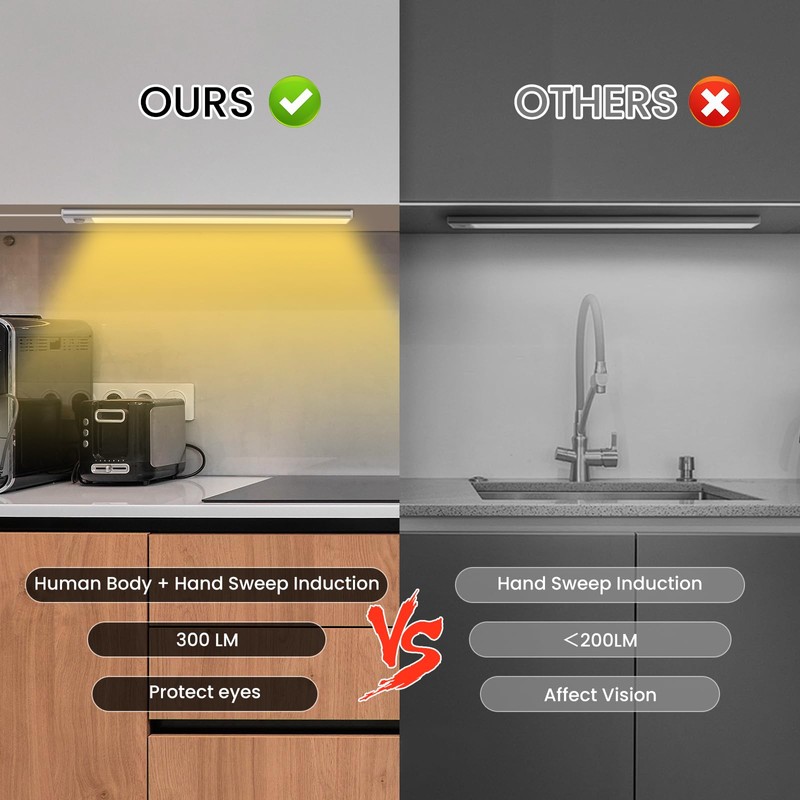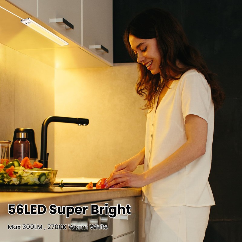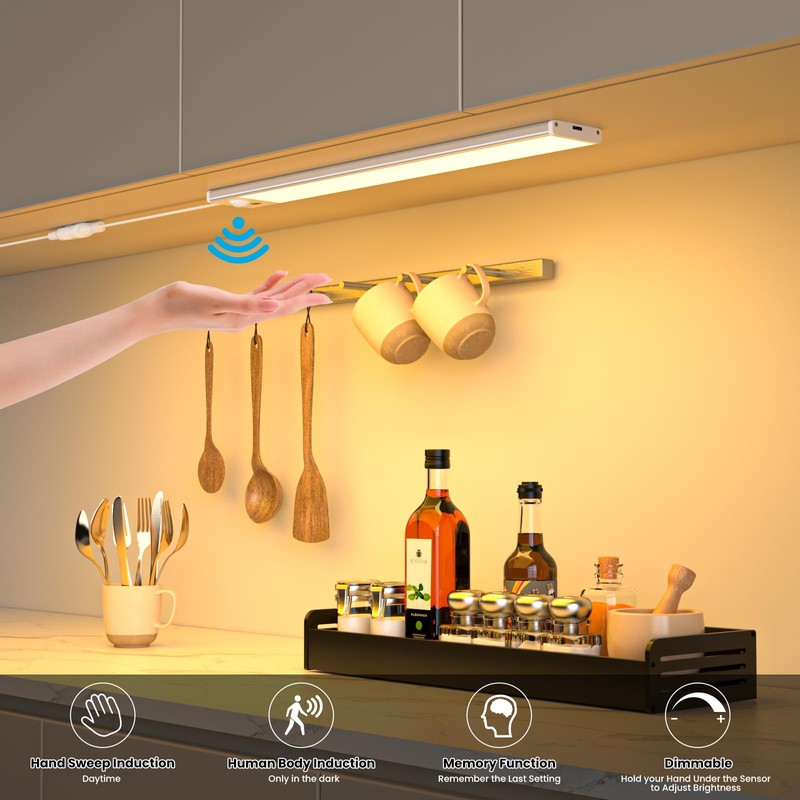 • Contactless sensor: under-unit light kitchen LED comes with a non-contact sensor that allows a quick response. Simply wave with your hand about 3-8 cm from the sensor to turn the light on and off. If your hands are wet or dirty, you can turn it on or off without touching the kitchen light base, which is more convenient and safe. When you work in the kitchen, you don't have to worry about staining the light bar.